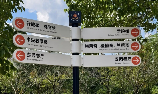针对校内标识牌老旧、信息模糊不清、文字内容较小、风格不一、设计缺乏创新和特色,难以体现学校的文化底蕴和品牌形象等问题,暑期由学校办公室牵头,对道路牌、多向指示牌、指引立牌、楼宇立牌,停车场立牌49处进行了改造更新。改造后的标识牌指向明确清晰,设计灵动生辉。