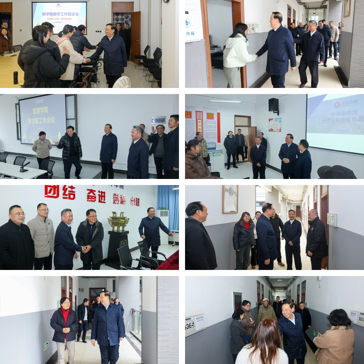 3月2日,武汉学院迎来新学期首个工作日。校园内秩序井然,各单位已从“寒假模式”平稳切换至“工作模式”,教职工以饱满的精神投入到新学期各项准备工作中。校领导带队深入各职能部门、教学单位走访慰问,向教职工送去新春的问候和祝福。