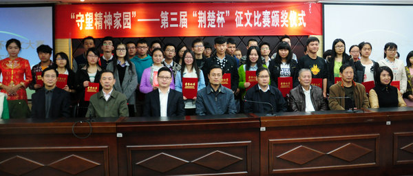11月6日下午,由共青团湖北省委、荆楚网主办,我院新闻传播系、湖北日报大学生记者团承办的“守望精神家园”第三届荆楚杯征文比赛颁奖仪式在我院一号报告厅隆重举行。