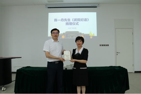 捐书仪式由武汉学院副校长黄保红主持,并由湖北一丹大学教育发展基金会理事长桂以萍代表基金会荣誉理事长陈一丹出席,向武汉学院陈一丹伉俪图书馆捐赠《武院纪语》以及陈一丹先生的亲笔墨宝一份。她说:“一丹先生一直非常重视对学生的培育,而图书馆是涵养学识的场所,对于熏陶学生言行、提升学生人格和修养都有着十分重要的作用。”黄保红对这份承载着智慧的温度和深度的礼物表示感谢:“书里的内容很好地阐释了学校的校训:明德创新,解行并进,对学校、每一位师生,甚至是任何认同武汉学院的公益办学理念的人们,都具有重要的指导意义。”