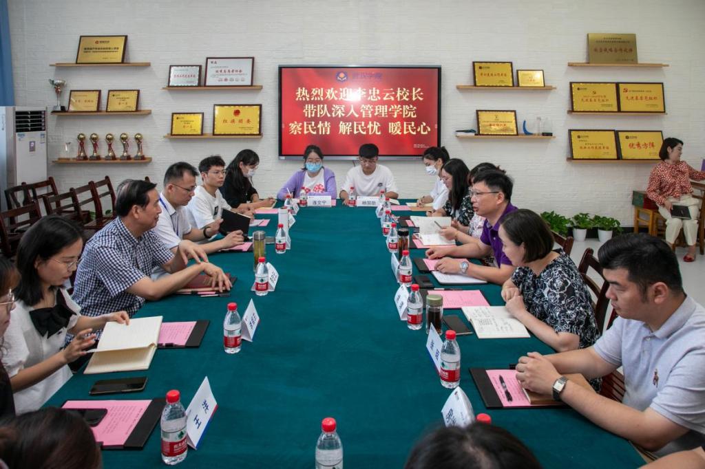 6月16日,武汉学院校长李忠云教授带队前往管理学院调研,深入开展党员干部下基层察民情解民忧暖民心实践活动,与师生代表交流,广泛听取意见和建议。