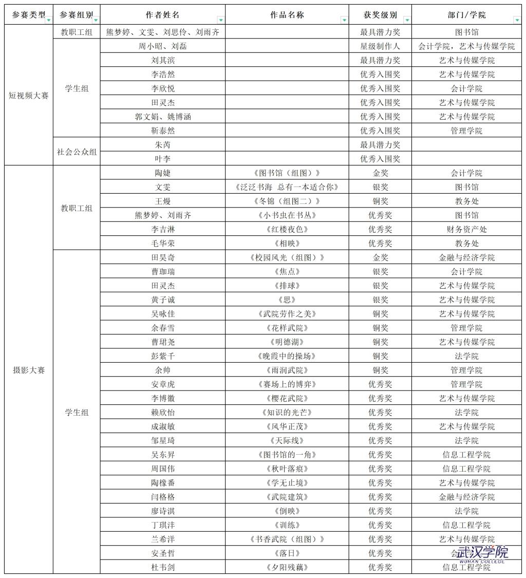 由湖北省高等教育学会摄影教育专业委员会、一丹大学教育基金会和武汉学院共同举办的“丹桂杯”第六届影像大赛,作品征集自2024年3月1日起至2024年5月5日结束,本次活动得到了全校师生和社会人士的大力支持,共收到摄影类参赛作品579幅,短视频类参赛作品30余(部)。经校外多名影像专家现场评审讨论,最终评选出39幅(部)获奖作品,其中学生组30幅(部),教工组7幅(部),社会公众组2部。现公示如下: