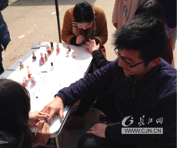 “三月女生季”是武汉学院的传统活动,每年都会有各种围绕着女生的活动展开。今年,该校新闻传播系别出心裁,决定为女生“美甲”。“因为我们平时会经常用到手,所以想到为双手‘美容’,而且女生嘛,都爱在指甲上涂涂画画的。”活动负责人陈同学说。